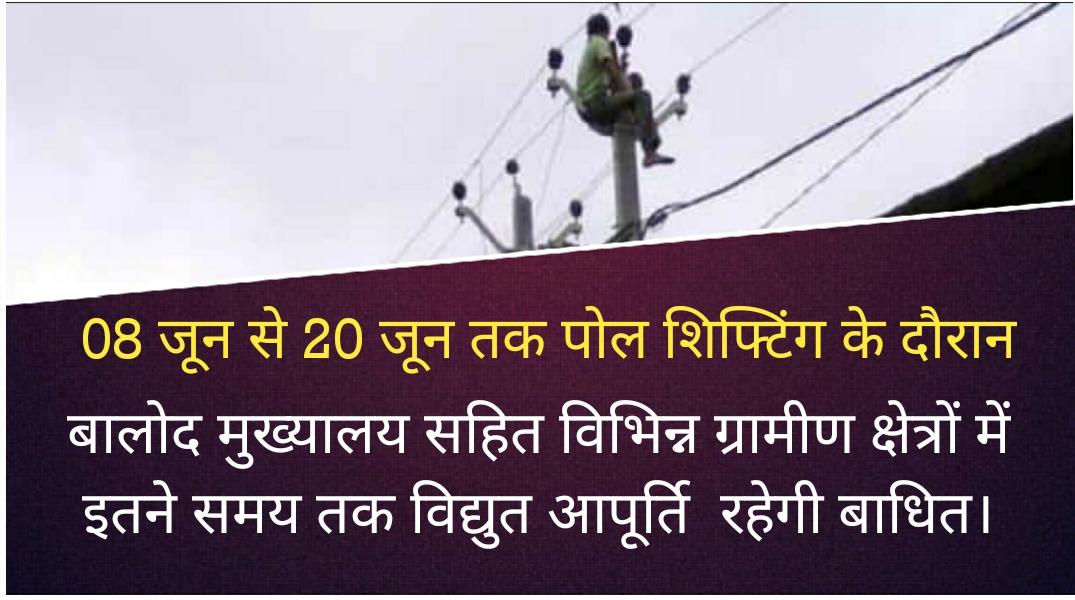 BALOD/ जिला मुख्यालय बालोद में राष्ट्रीय राजमार्ग चैड़ीकरण कार्य हेतु पोल एवं ट्रांसफाॅर्मर शिफ्टिंग का कार्य निरंतर जारी है। जिसमें 33/11 के.व्ही. उपकेंद्र से निकलने वाली 11 के.व्ही. टाउन फीडर में 08 जून से 20 जून 2023 तक प्रतिदिन सुबह 06.30 बजे से सुबह 11.30 बजे तक विद्युत आपूर्ति बाधित रहेगी। विद्युत विभाग के कार्यपालन अभियंता ने बताया कि प्रभावित क्षेत्र में जुर्रीपारा से गंजपारा तक, सुमित बाजार, जिला अस्पताल, औंराभांटा, बीएसएनएल, जुर्रीपारा, पुलिस थाना, पुलिस कालोनी, कॉलेज, गंगासागर, जेल, आईटीआई, न्यू बस स्टैण्ड एवं आस-पास के क्षेत्र शामिल है। उन्होंने बताया कि इसके अलावा झलमला, बघमरा एवं पाररास फीडर में भी आवश्यकतानुसार विद्युत आपूर्ति बाधित हो सकता है। इसके प्रभावित क्षेत्र में झलमला, बघमरा, जगतरा एवं पाररास फीडर के अंतर्गत आने वाले सभी वार्ड शामिल है।