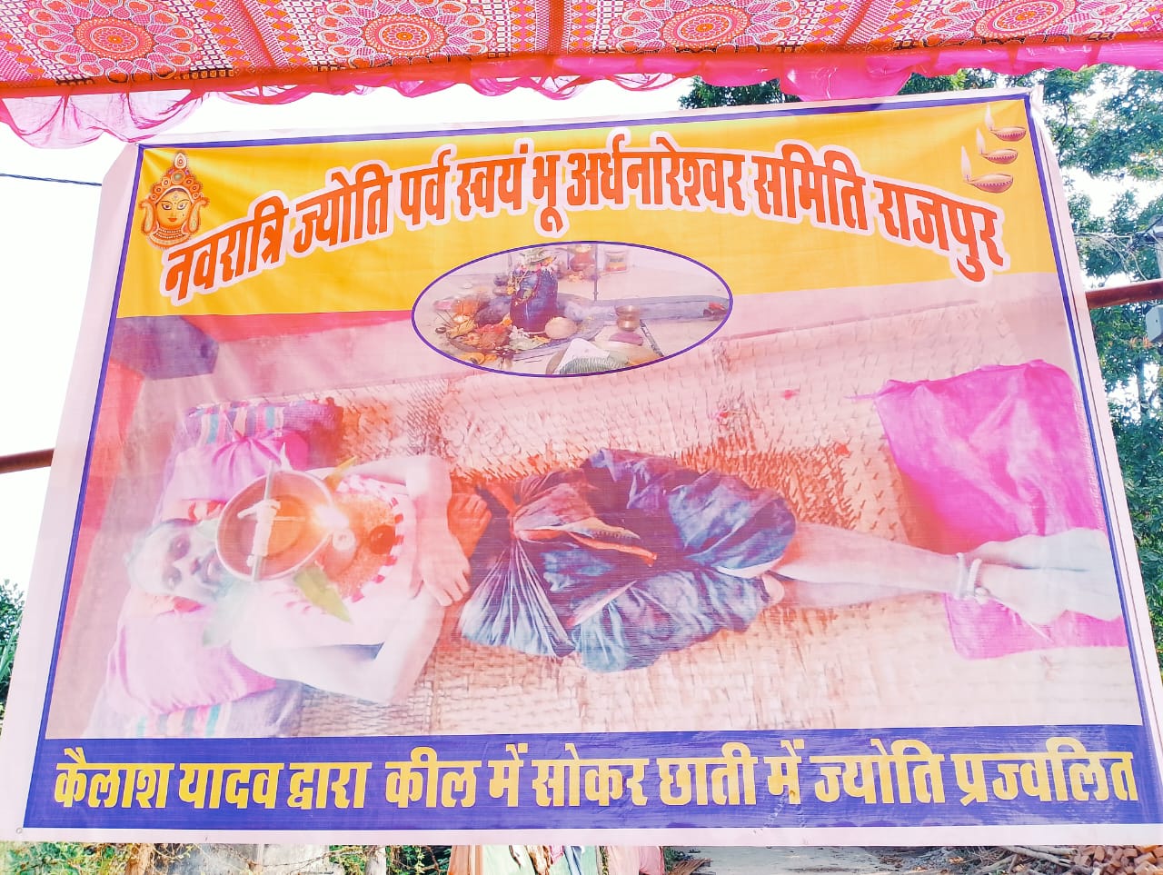 जिसमे कैलाश यादव ने माता रानी को प्रसन्न कर सुख समृद्धि के लिए 5000 किलों की शैय्या में लेटे हुए हैं साथ ही छाती पर भक्ति दीप जलाए हुए हैं।बता दें कैलाश यादव का यह कलश धारण करने की साधना का चौथा साल है लेकिन किलों की शैय्या में लेटकर साधना इस वर्ष ही कर रहे हैं।साधना के दौरान ही लेटकर वे दूध,पानी और फल का सेवन कर रहे हैं।उनके दर्शन करने आस पास के क्षेत्रों से भारी संख्या में भक्त अर्धनारेश्वर महादेव मंदिर पहुंच रहे हैं।