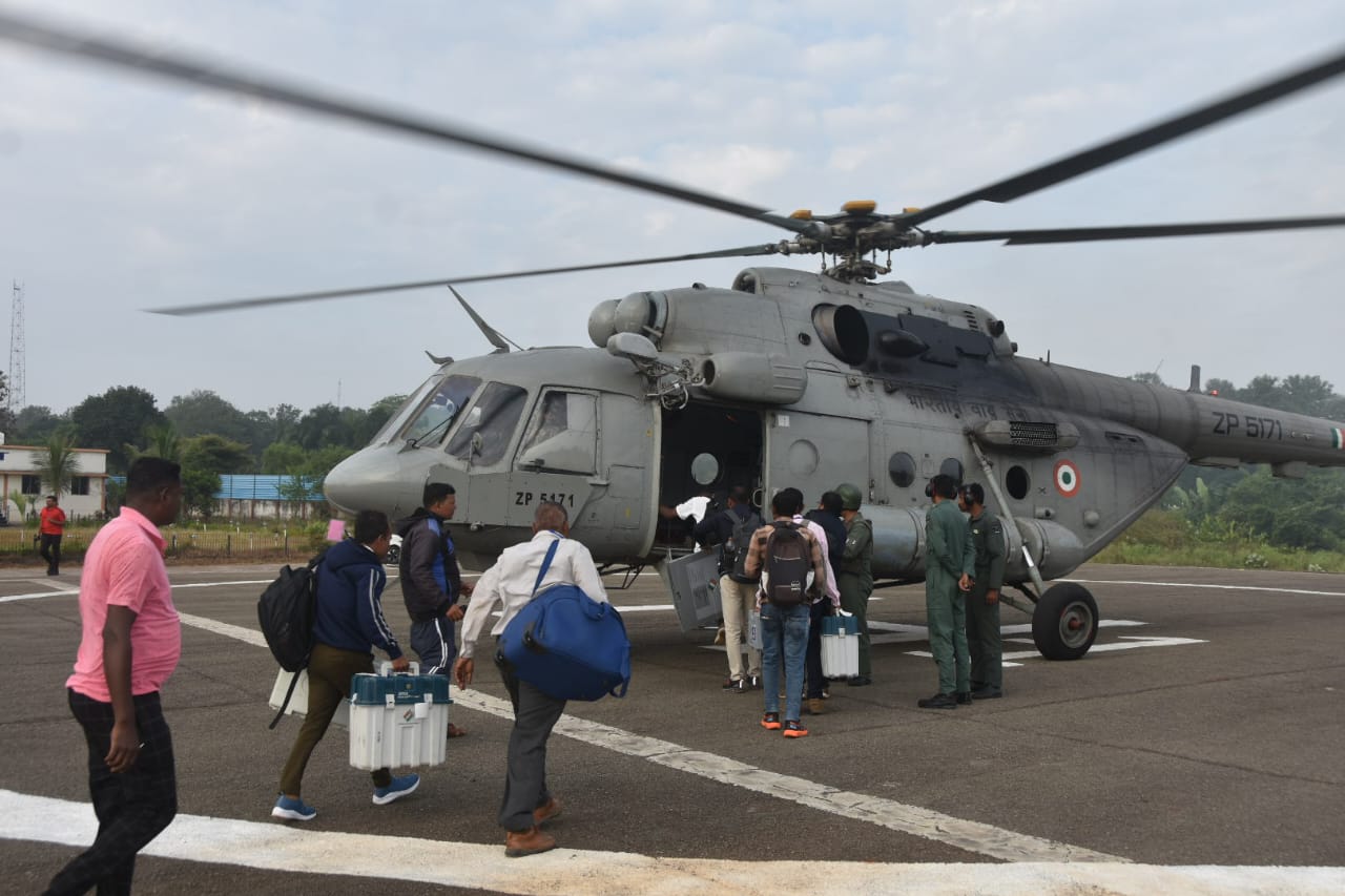 7 तारीख को होने वाले चुनाव के लिए मतदान कर्मी हेलीकॉप्टर ,बस से हुए रवाना , स्ट्रांग रूम से मतदान सामग्री और ईव्हीएम सहित वीवीपेट वितरण के बाद मतदान कर्मी हुए रवाना