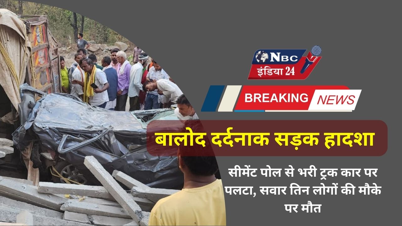 छत्तीसगढ़ के बालोद जिले में दर्दनाक सड़क हादसा हुआ है जिसमें कार सवार तीन लोगों की कार में दबकर मौत हो गई है घटना जिले के पुरुर थाना क्षेत्र धमतरी-कांकेर नेशनल हाईवे मरकाटोला घाट की है जहां सीमेंट पोल से भरी ट्रक मोड में अनियंत्रित होकर हुंडई कार के ऊपर पलट गया जिसमें दबकर कार सवार तीन लोगों की मौके पर ही दर्दनाक मौत हो गई है