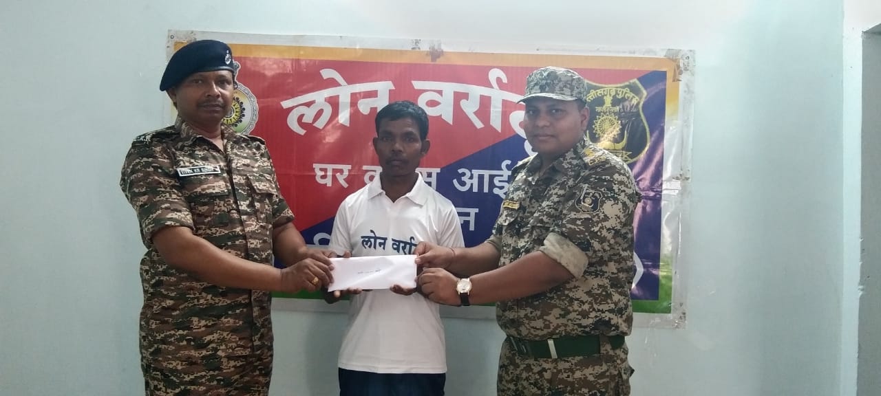पुलिस अधीक्षक दन्तेवाड़ा द्वारा आत्मसमर्पित माओवादी को छत्तीसगढ़ शासन द्वारा पुनर्वास योजना के तहत् 25 हजार रूपये प्रोत्साहन राशि प्रदाय किया गया, साथ ही पुनर्वास योजना के तहत मिलने वाले सभी प्रकार का लाभ प्रदाय कराया जायेगा।