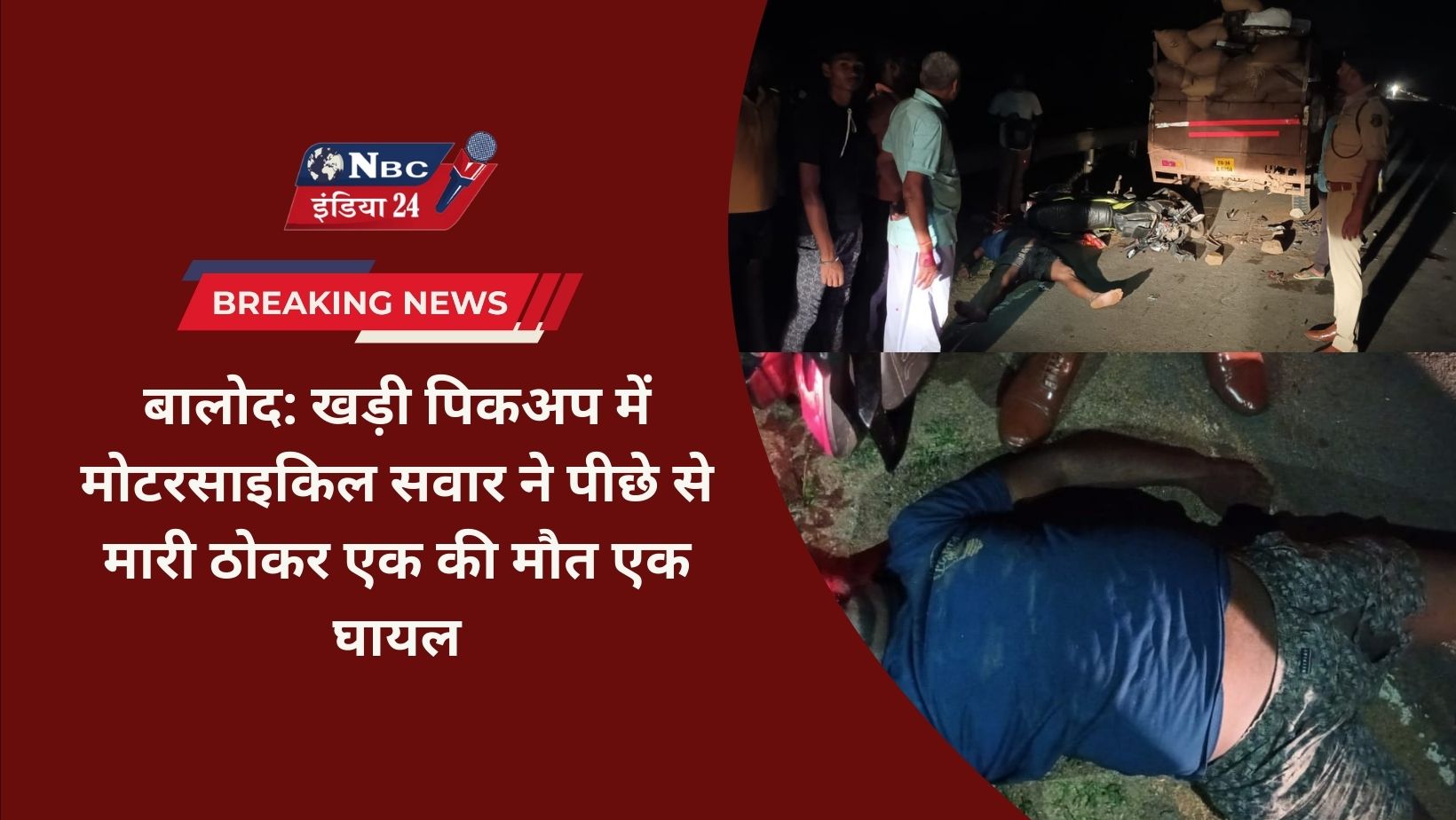 बालोद जिला के बालोद-गुरुर मुख्य राष्ट्रीय राजमार्ग 930 में करहीभदर के पास सड़क हादसे में मोटरसाइकिल सवार एक व्यक्ति की मौत और एक घायल हो गया जिन्हें तत्काल उपचार हेतु जिला अस्पताल ले जाया गया है। मिली जानकारी के अनुसार पिकअप वाहन में धान लोडकर गुरुर की ओर जाने के दौरान वाहन में खराबी आने से उसे सड़क किनारे खड़ा किया गया था इसी बीच करहीभदर की ओर जा रहे मोटरसाइकिल सवार दो व्यक्ति ने पिकअप को पीछे टक्कर मार दिया मोटरसाइकिल सवार दोनों व्यक्ति जय मां दंतेश्वरी शक्कर कारखाना करकाभाट के कर्मचारी बतलाए जा रहे सड़क हादसा में जी विनोद भिलाई निवासी की मौके पर ही मौत हो गई तो वही ओम प्रकाश ठाकुर जय मां दंतेश्वरी शक्कर कारखाना के इंजीनियर घायल हो गए जिन्हें उपचार के लिए जिला अस्पताल ले भेजा गया।