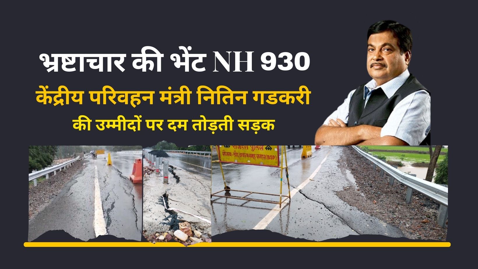 केंद्रीय परिवहन मंत्री नितिन गडकरी को अब स्वयं इस भ्रष्टाचार के भेंट चढ़ी सड़क पर संज्ञा लेने की आवश्यकता है नितिन गडकरी की पहचान एक सफल मंत्रियों में होती है जो अपने कुशल नेतृत्व से पूरे भारत में सड़कों का जाल बिछा एक नया आयाम लिखते जा रहे हैं लेकिन नेशनल हाईवे 930 के अधिकारी और ठेकेदार उनके नाम और पहचान को धूमिल करते दिखाई दे रहे हैं।