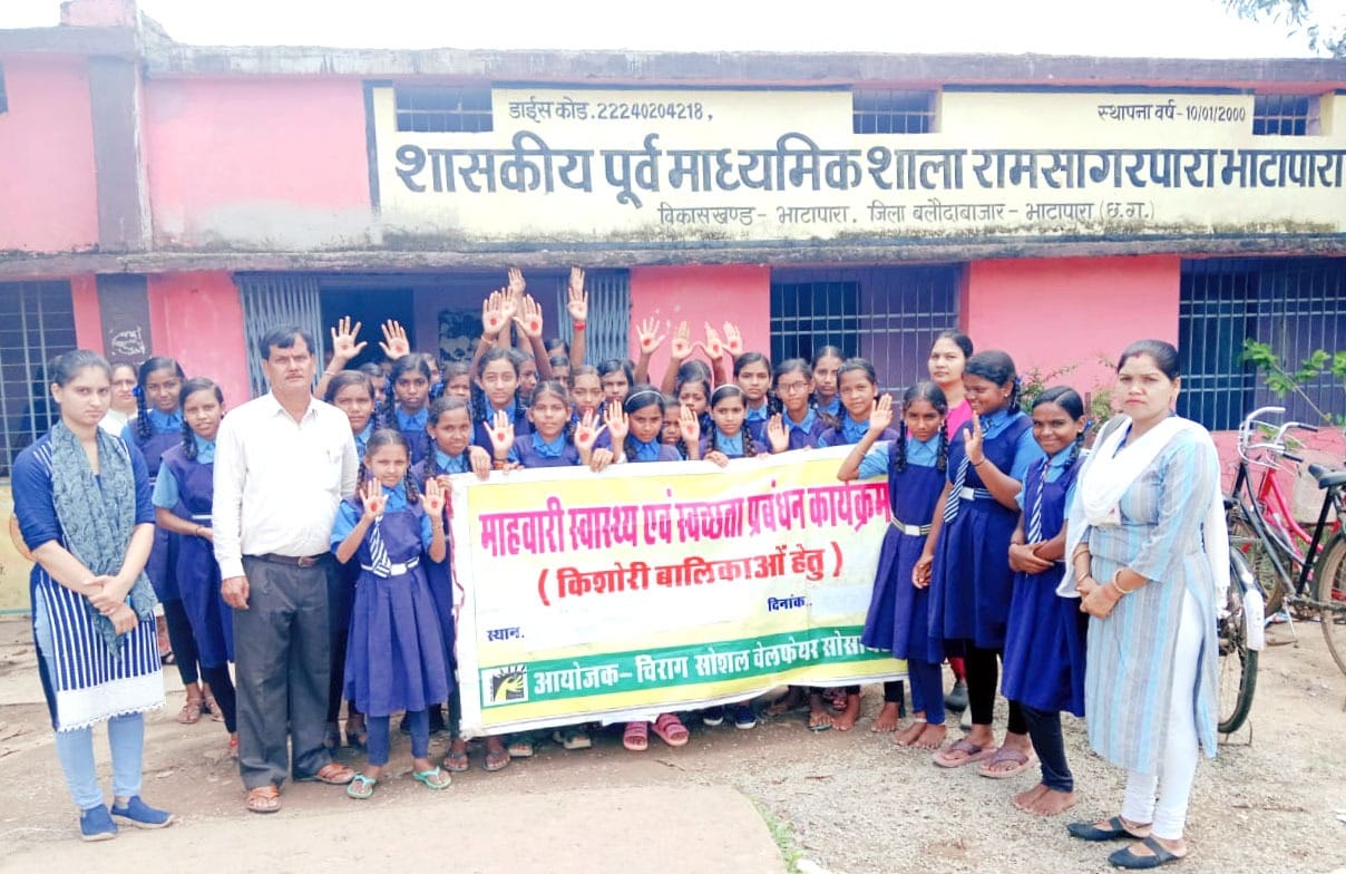 भाटापारा @ छत्तीसगढ़ राज्य एड्स नियंत्रण समिति रायपुर के सहयोग से चिराग सोशल वेलफेयर सोसायटी अम्बिकापुर द्वारा संचालित लक्ष्यगत हस्तक्षेप परियोजना भाटापारा जिला बलौदाबाजार एवं छत्तीसगढ़ एलायंस फार बिहैवियर चेन्ज के संयुक्त तत्वावधान् में शासकीय पूर्व माध्यमिक शाला रामसागर पारा भाटापारा जिला बलौदाबाजार -भाटापारा छत्तीसगढ़ में लक्ष्यगत हस्तक्षेप परियोजना भाटापारा के परियोजना निदेशक मंगल पाण्डेय के मार्गदर्शन में तथा परियोजना प्रबंधक दशोदी सिंह के नेतृत्व में माहवारी स्वास्थ्य एवं स्वच्छता प्रबंधन विषय पर जागरूकता कार्यक्रम का आयोजन किया गया।