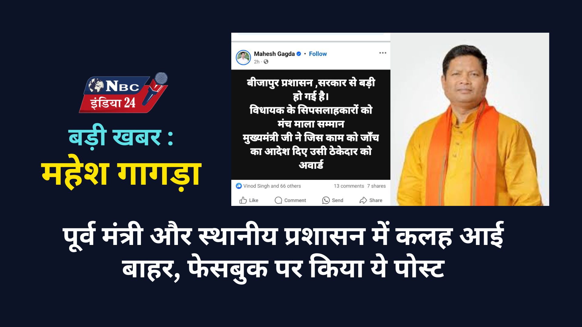 पूर्व मंत्री और स्थानीय प्रशासन में कलह आई बाहर, पूर्व मंत्री महेश गागड़ा ने फेसबुक पर किया पोस्ट। विधायक(कांग्रेस से) को तबज्जू देने, और मुख्यमंत्री के आदेश(जांच संबंधित)की अवहेलना का आरोप लगाते कथित ठेकेदार को सम्मानित करने का लगाया आरोप। सोशल मीडिया पर तेजी से वायरल हुआ पोस्ट। जमकर हो रही चर्चा। उठ रहे सवाल। पिछले दिनों कलेक्टर और भाजपा नेता में बहस का आडियो हुआ था वायरल। अजय सिंह और कलेक्टर अनुराग पांडे में जमकर हुई थी तकरार, अब पूर्वांत्री ने सोशल मीडिया पर निकाली खीज। बाजार में चर्चाओं का बाजार गर्म। बीजापुर में भाजपा वर्सेज प्रशासन की चर्चा।