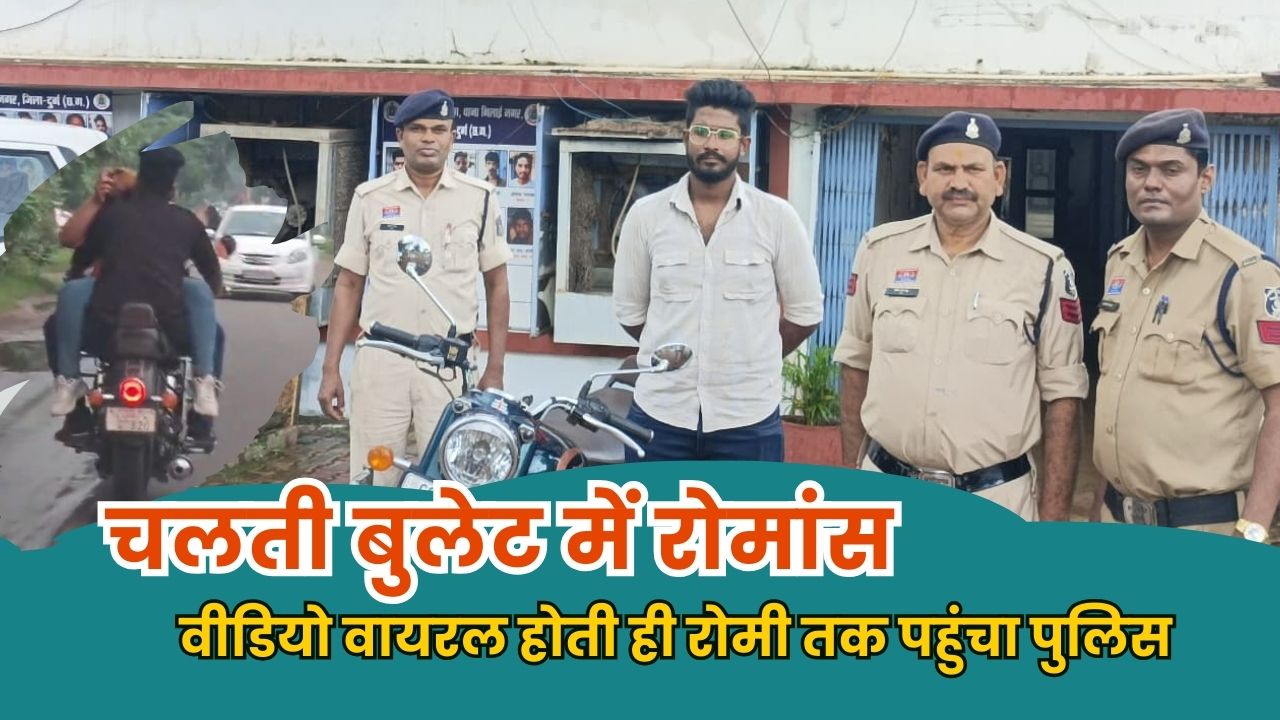छत्तीसगढ़ के भिलाई में फिल्मी अंदाज में एक कपल का चलती बुलेट गाड़ी की पेट्रोल टंकी पर बैठकर रोमांस का वीडियो वायरल हो गया। चलती बुलेट में लड़की बुलेट की पेट्रोल टंकी पर बैठकर गाड़ी चला रहे बॉयफ्रेंड से गले लिपटकर रोमांस करती नजर आ रही है।