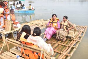 जलाशय की शांत लहरों पर बैम्बू राफ्टिंग का दृश्य आकर्षण का प्रमुख केंद्र रहा।